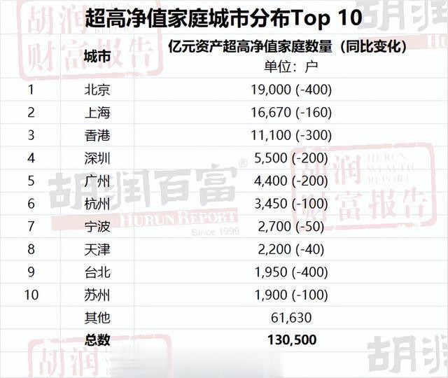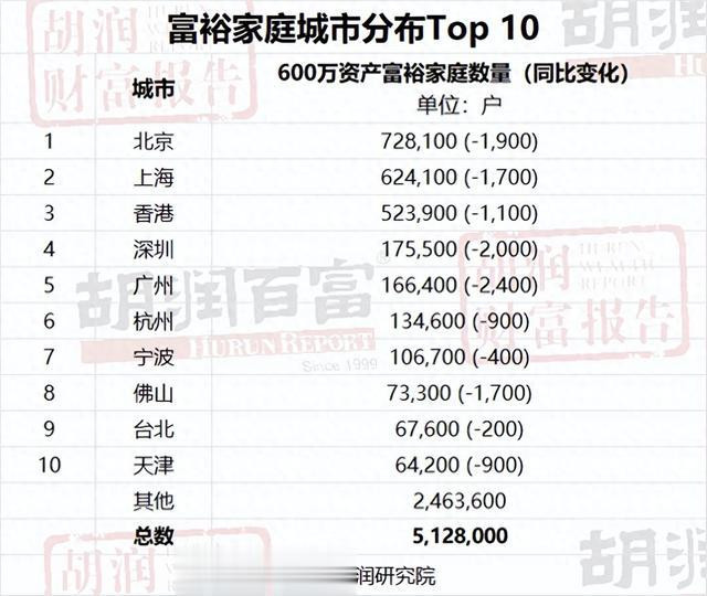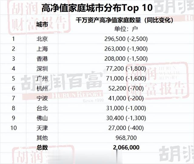 广东继续领跑千万资产高净值家庭数量,尽管较去年减少了2,400户,总数仍达到29.8万户,其中拥有千万可投资资产的家庭为16.8万户。北京以29.6万户位居第二,同比减少2,500户,拥有千万可投资资产的家庭为15.1万户。上海位列第三,高净值家庭数量为26.3万户,同比减少1,900户,拥有千万可投资资产的家庭为14.6万户。浙江以21.3万户排名第四,同比减少1,800户,拥有千万可投资资产的家庭为10.7万户。香港则以20.8万户位列第五,同比减少1,500户,拥有千万可投资资产的家庭为10.6万户。