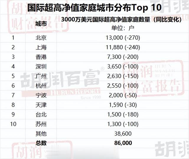 北京依然是拥有最多3000万美元资产的国际超高净值家庭的地区,尽管数量比上年减少了270户,降至13,000户,跌幅为2%,其中拥有3000万美元可投资资产的家庭有8,960户。上海以11,880户位居第二,比上年减少了240户,跌幅为1.9%,拥有3000万美元可投资资产的家庭有7,260户。广东位列第三,国际超高净值家庭数量为11,280户,比上年减少了240户,跌幅为2.1%,拥有3000万美元可投资资产的家庭有6,800户。浙江排名第四,国际超高净值家庭数量为9,940户,比上年减少了210户,跌幅为2.1%,拥有3000万美元可投资资产的家庭有6,240户。香港以7,300户位列第五,比上年减少了200户,跌幅为2.7%,拥有3000万美元可投资资产的家庭有4,380户。